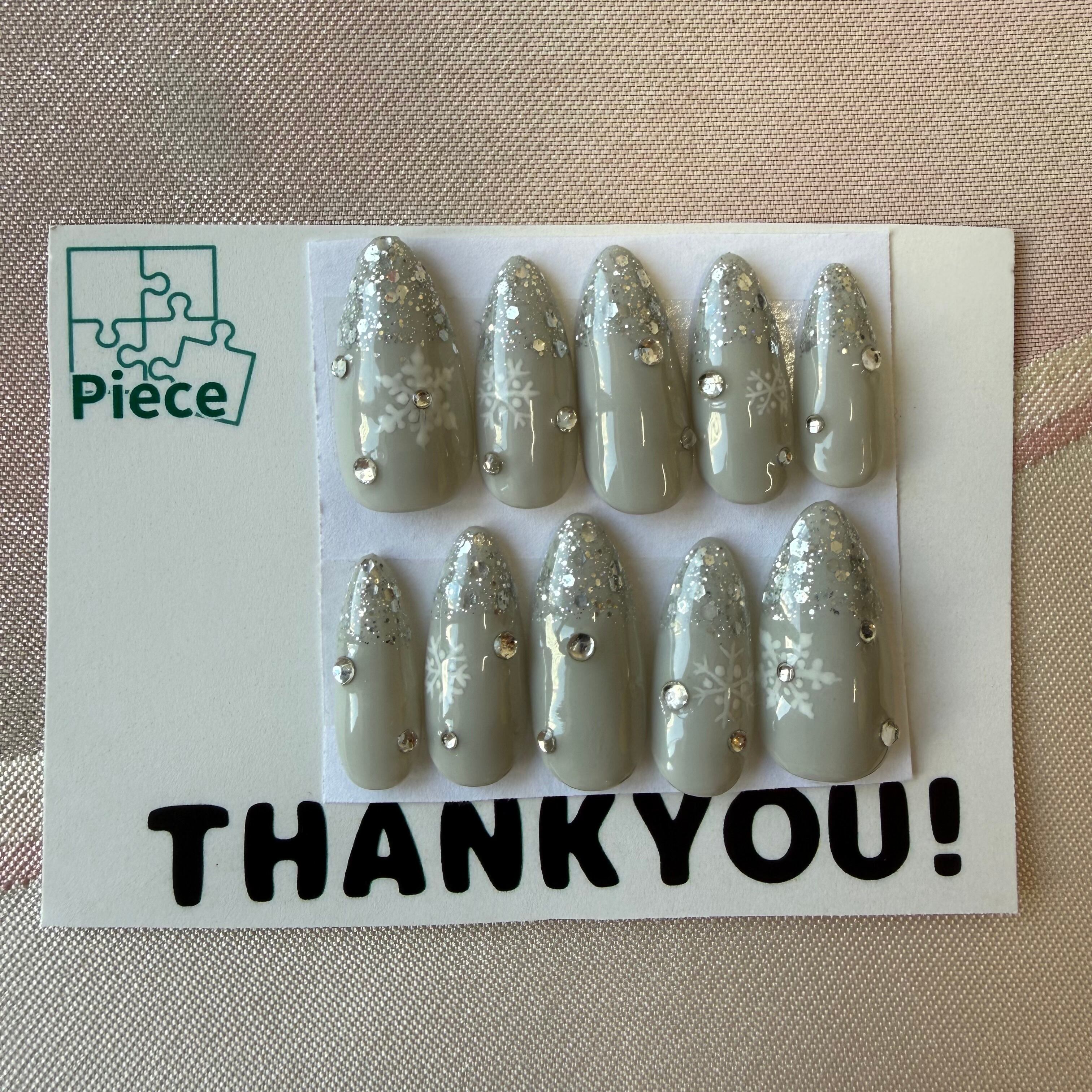 落ち着いたグレージュをベースに、繊細な雪の結晶を散りばめました。キラリと光るストーンが、まるで本物の雪が光を反射しているよう。どんな服装にも合わせやすく、冬の日常を少し特別にしてくれる上品なデザインです。